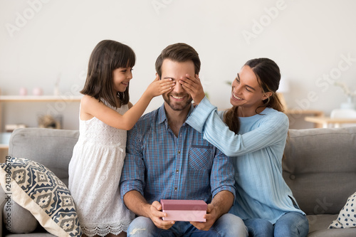 smiling dad receiving gift on fathers daddy daughter birthday surprise