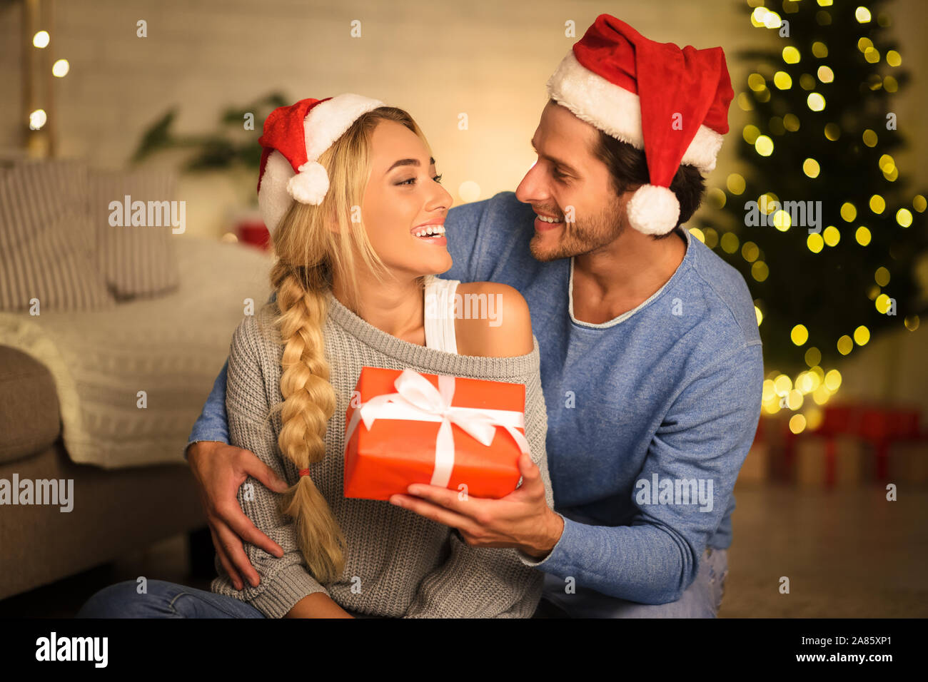 Christmas concept. Happy guy giving christmas box for girlfriend