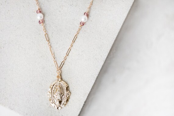 Gold Pearl Miraculous Medal Necklace mothers medal of honor necklace