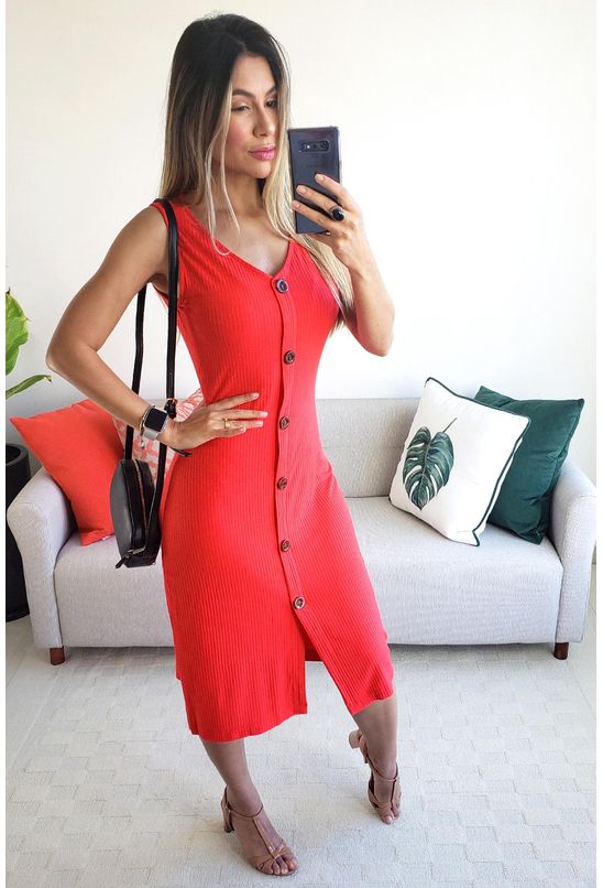 Vestido midi morena rosa decote v com botão coral - Babadotop vestido coral midi