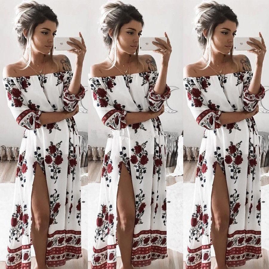 Compre Moda Bohemian Maxi Vestidos De Impressão Estampada Dividir Vestido Longo Mulheres Praia Verão Barra De Pescoço Sexy Vestido Eleagnt Dividir Vestidos Boho S 2XL De Lyming001, $82,53 | Pt.Dhgate.Com vestido longo estampado praia