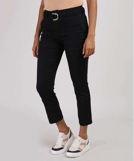 Calça de Sarja Feminina Sawary Cropped Cintura Alta com Cinto Preta - cea calça de sarja preta feminina cintura alta