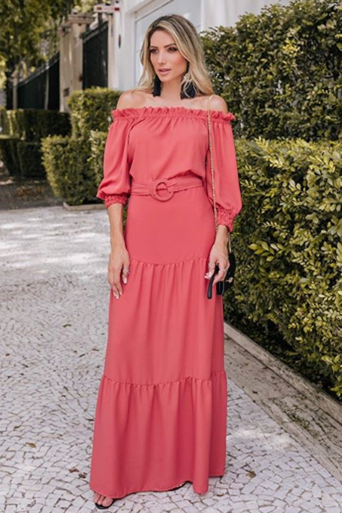 Vestido longo ombro á ombro, manga bufante com elástico, com cinto - Cód. 1753 vestido ombro a ombro com elastico