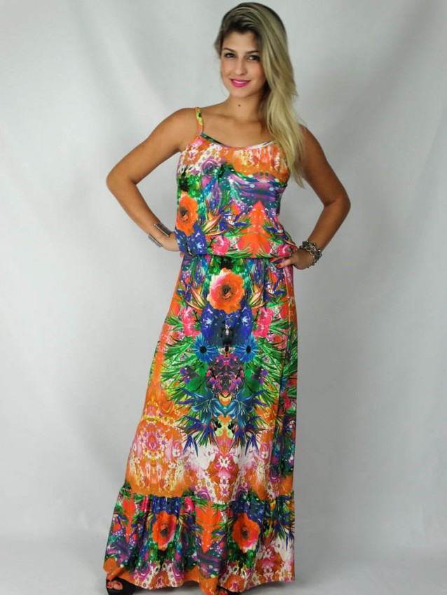 Vestido longo com alça fina e babado estampa tropical vestido longo estampa tropical