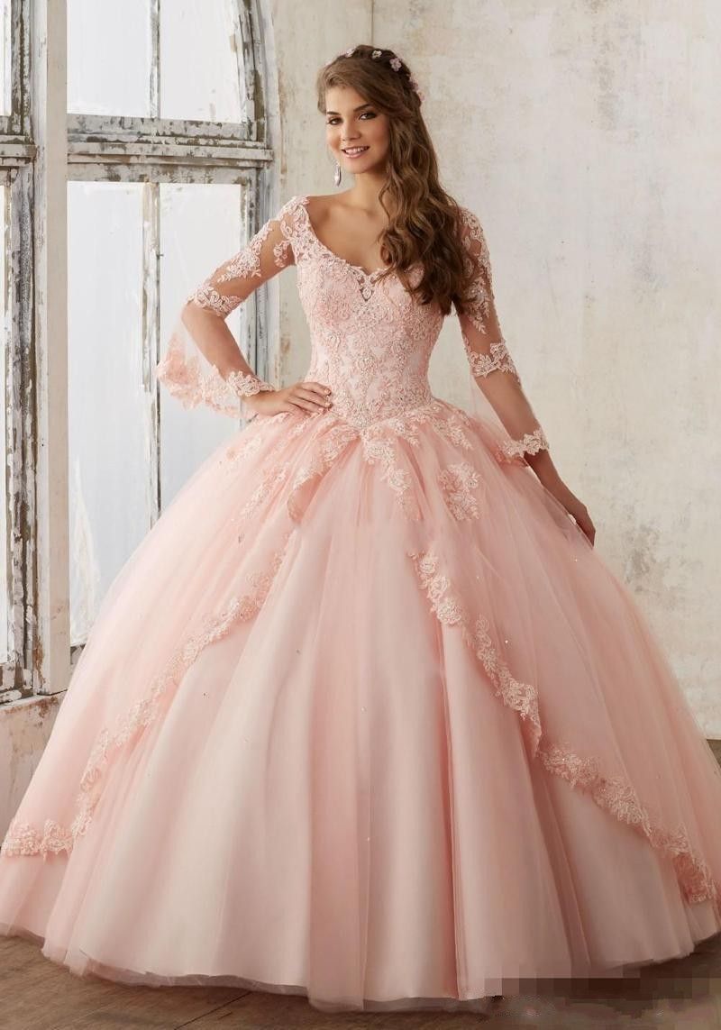 Vestido Para Festa Infantil Blush Rosa Vestido De Baile Vestidos Quinceanera 2020 Long Sleeve Backless Lace Applique Prom Party Vestidos Doce 16 Vestido De Aniversário Vestido De 16 Años Lojas De Noivas vestidos color pink blush