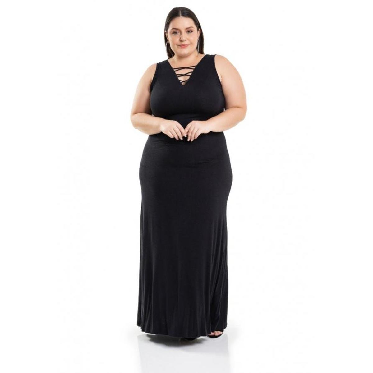 Vestido Longo Malha de Viscose Decote com Tiras Miss Masy Plus Size Feminino | Netshoes vestido longo preto de malha plus size