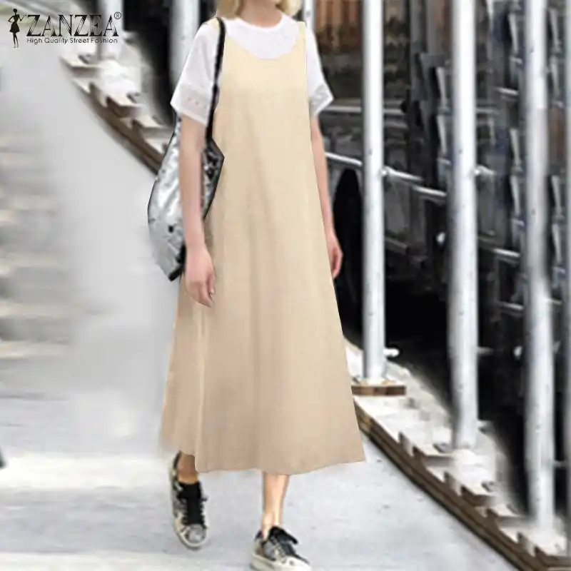 Zanzea 2020 verão feminino meados de bezerro vestido macacão vestidos feminino sem mangas algodão sundress sólidos tanques midi vestidos praia robe|Vestidos| - AliExpress macacão e vestidos