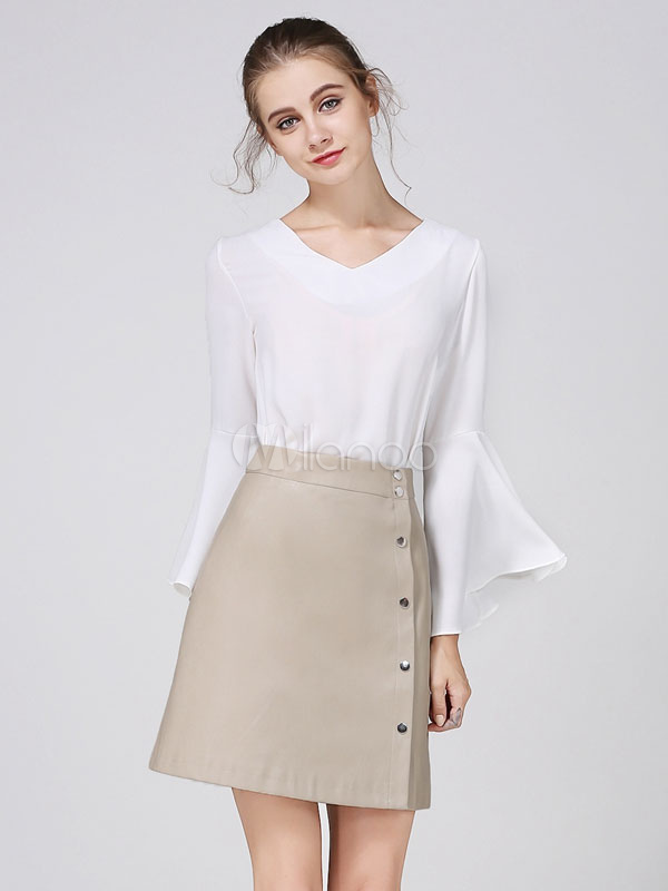 PU em camadas botão frontal saia curta de mulheres de saia lápis cáqui - Milanoo.com saia lapis com botoes na frente