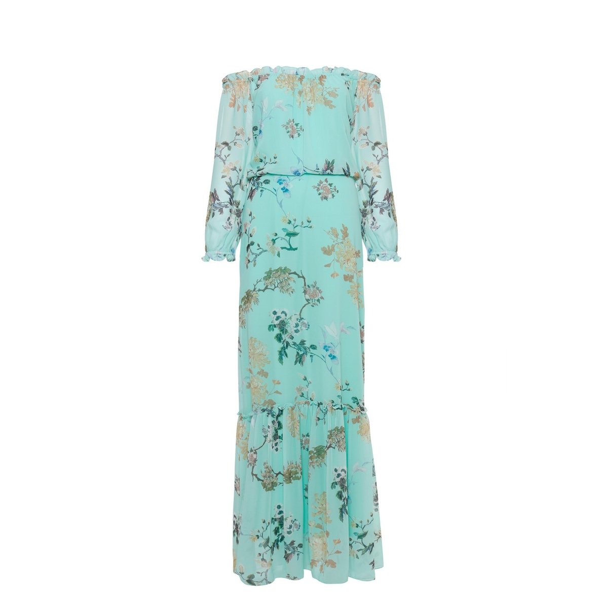 VESTIDO CREPE LONGO ALÇA BABADO FLORAL MADALENA vestido longo crepe floral