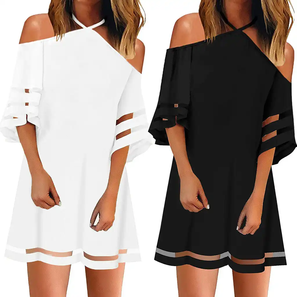 Elegante vestido de verão 2019 feminino frio ombro malha painel blusa 3/4 sino manga solta camisa superior vestido vestidos femme vestidos femme femme femme femme|Vestidos| - AliExpress vestidos com blusa de frio