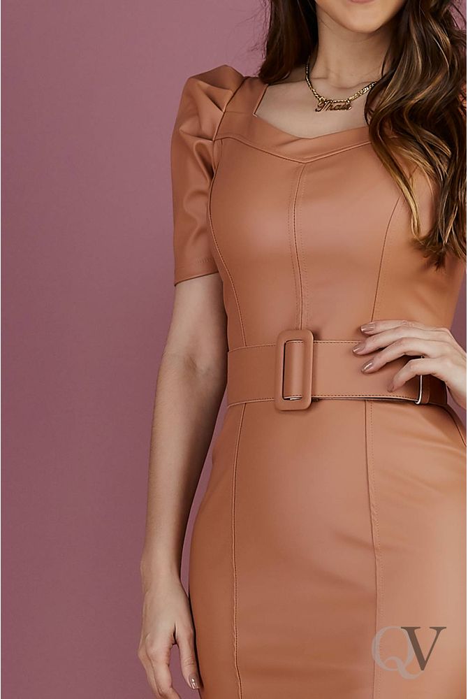Vestido Recortes Couro Nude Tata Martello Moda Evangélica Feminina - QVestido - Qvestido Mobile - 2019 vestido de couro nude