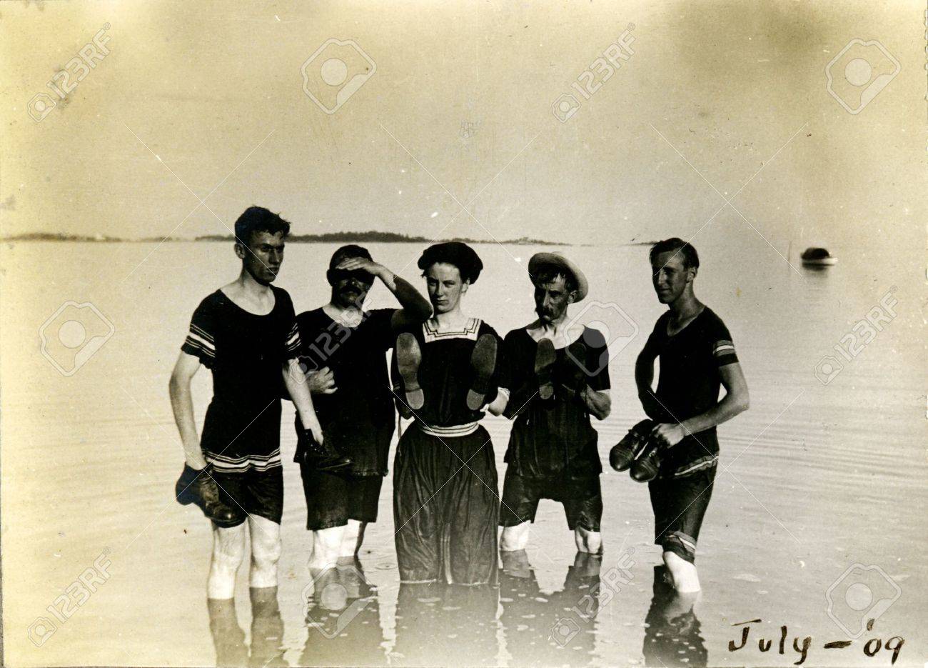 Vintage black and white photograph of vintage swimmers
