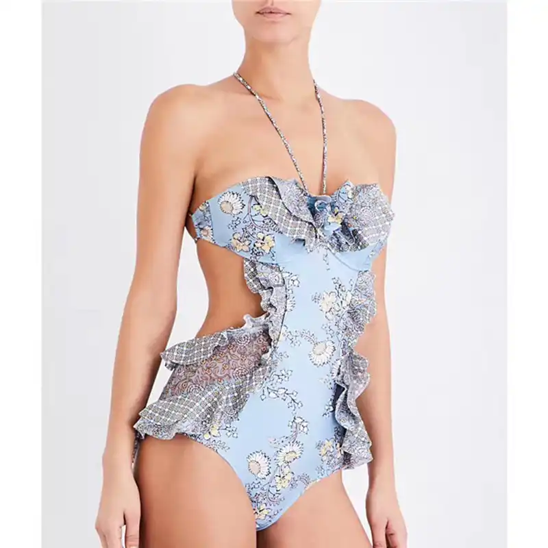 KEKAKA 2019 Vintage Retro Blue Floral peplum one piece bathing suit