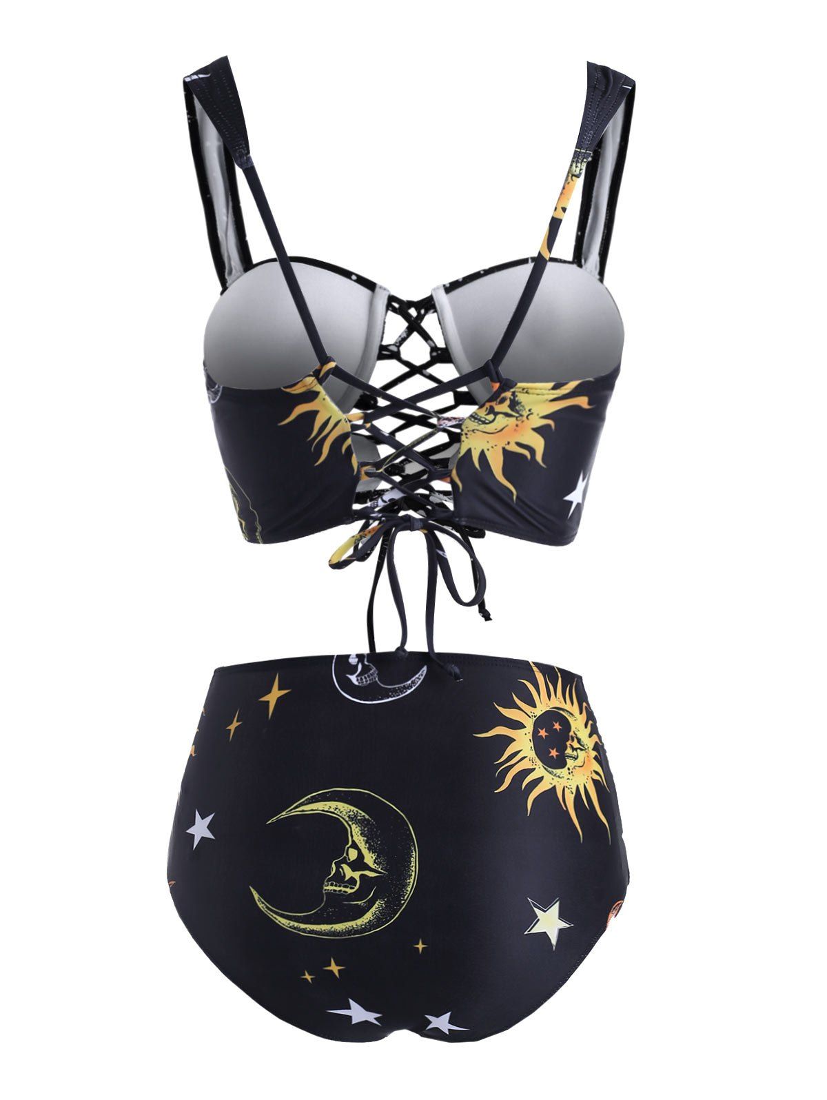 ZAFUL Sun and Moon Lace Up Tummy sun moon star print lace up tummy control tankini swimwear