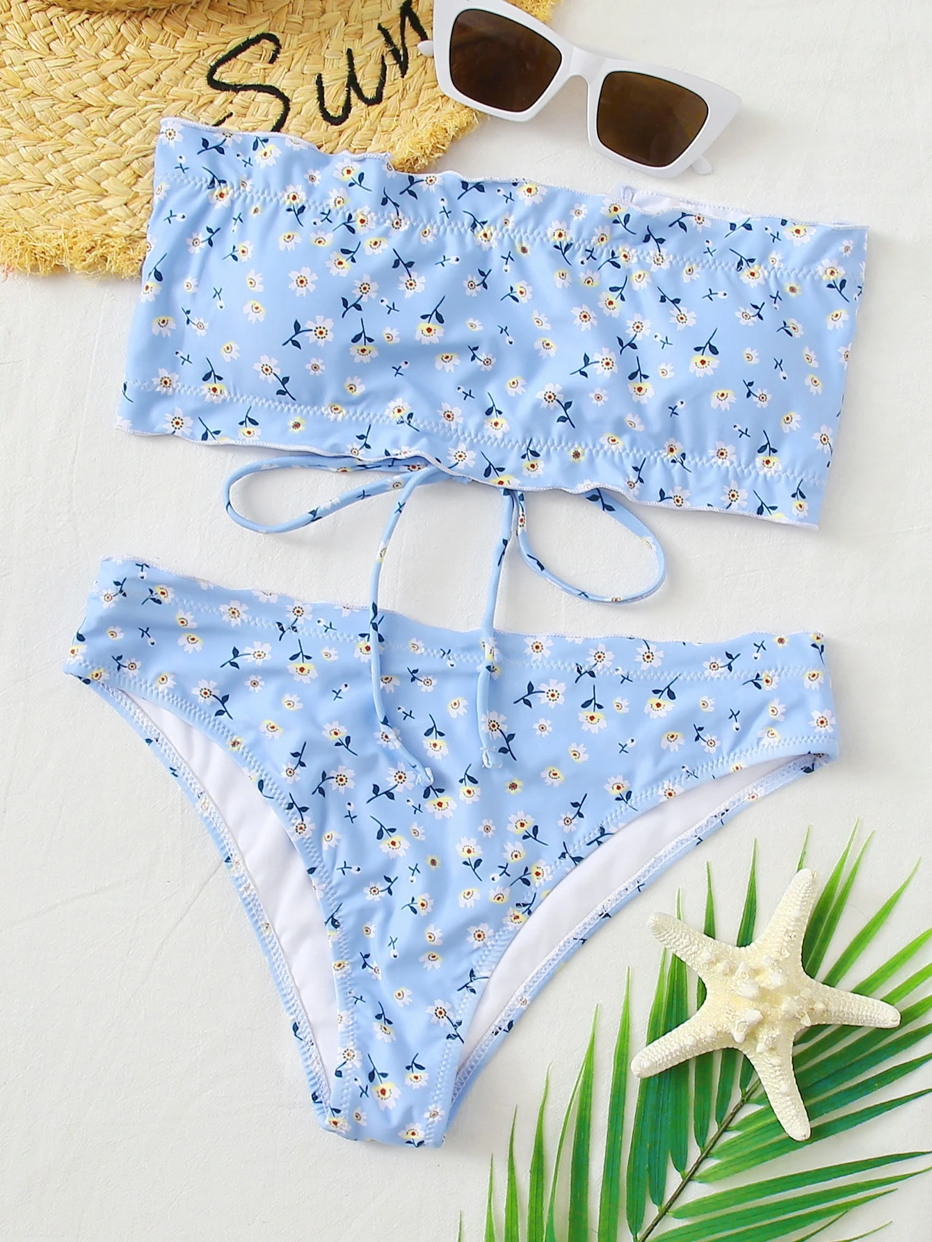 Bandeau Bikini Swimsuit | SHEIN blue and floral lace up bikini