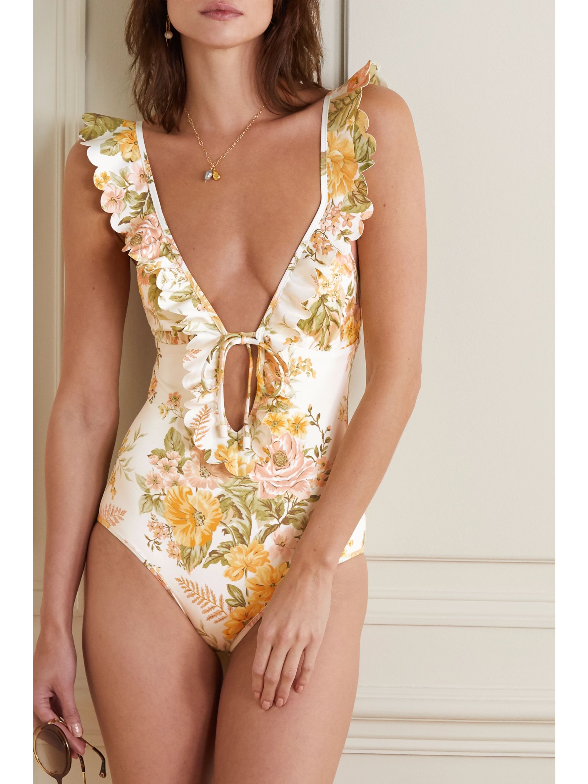 Ivory Amelie ruffled floral-print zimmermann swimsuit