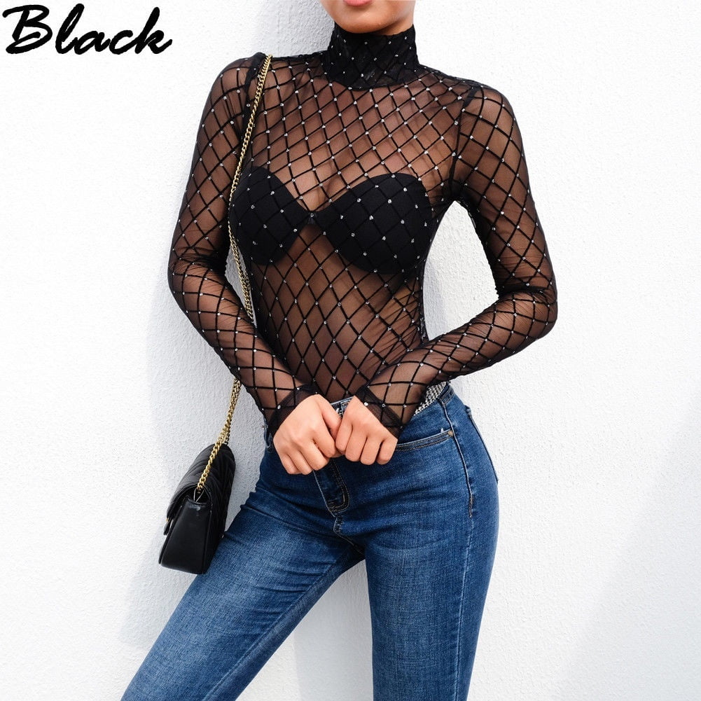 Sexy Bodysuit Mesh Sheer Black Lace sheer turtleneck bodysuit