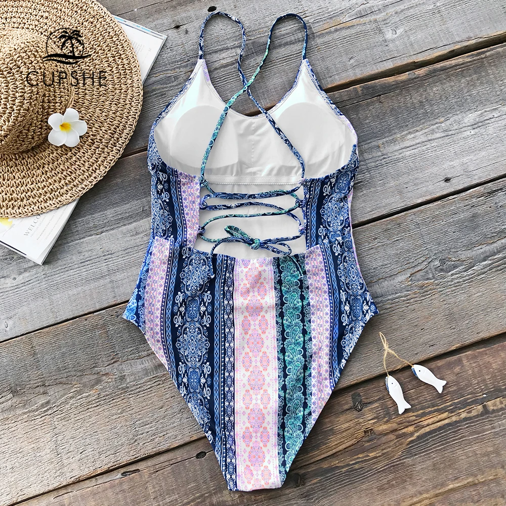 Print Lace up One-Piece Beach Swimsuit cupshe lace up one piece